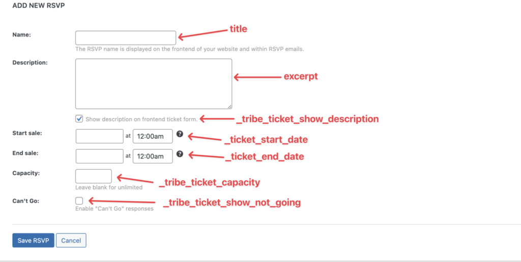 These are all the arguments available when creating a new RSVP. This diagram shows what each key represents if you were to create an RSVP using the classic editor admin dashboard: